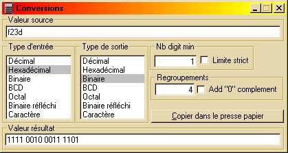 | Convert | Converti les bases decimal, hexadecimal, binaire, binaire reflechi, octal et ASCII dans n'importe quelle sens. |  |  |  | | 31/06/2006 | 16/10/2004 |